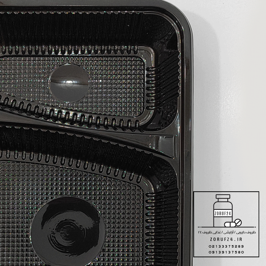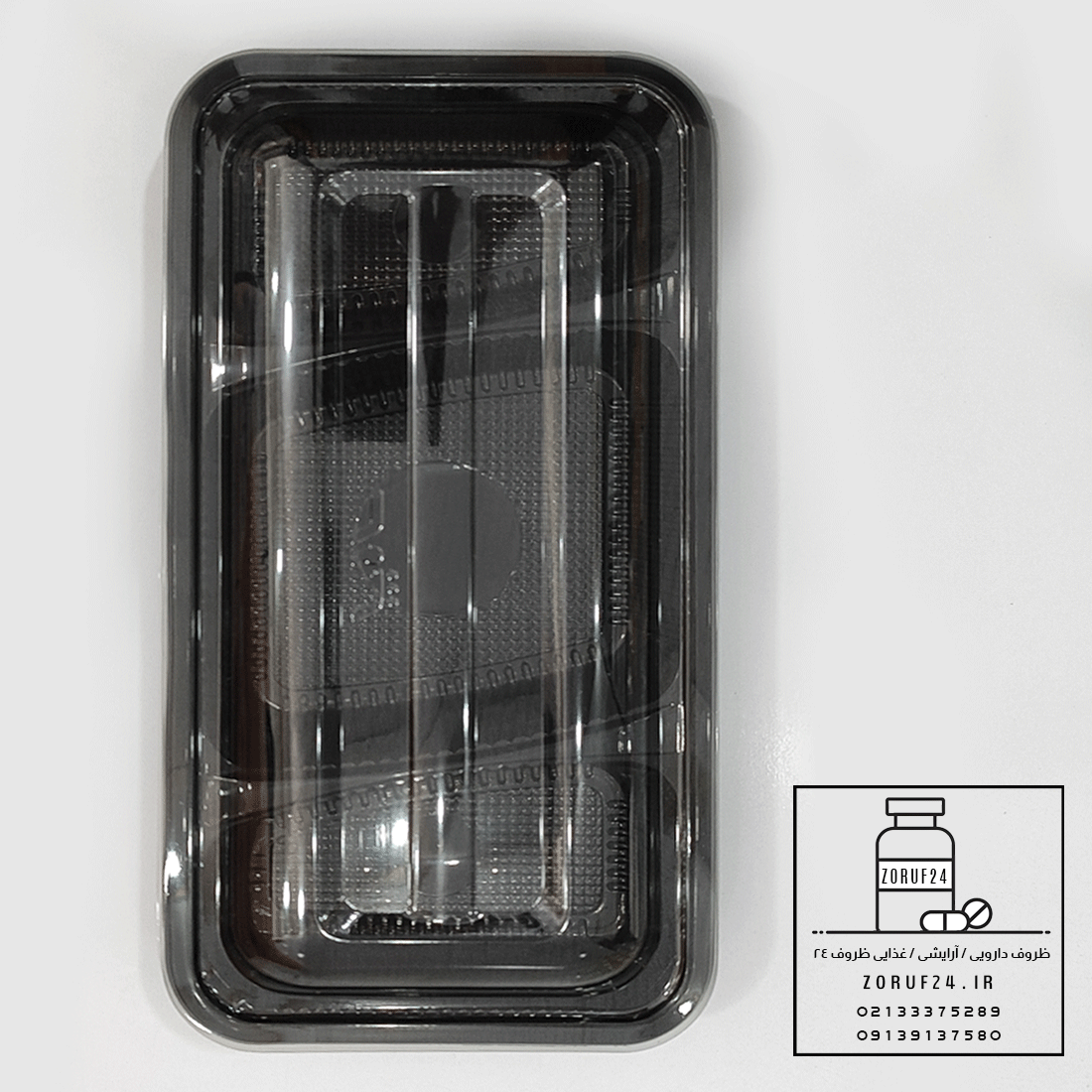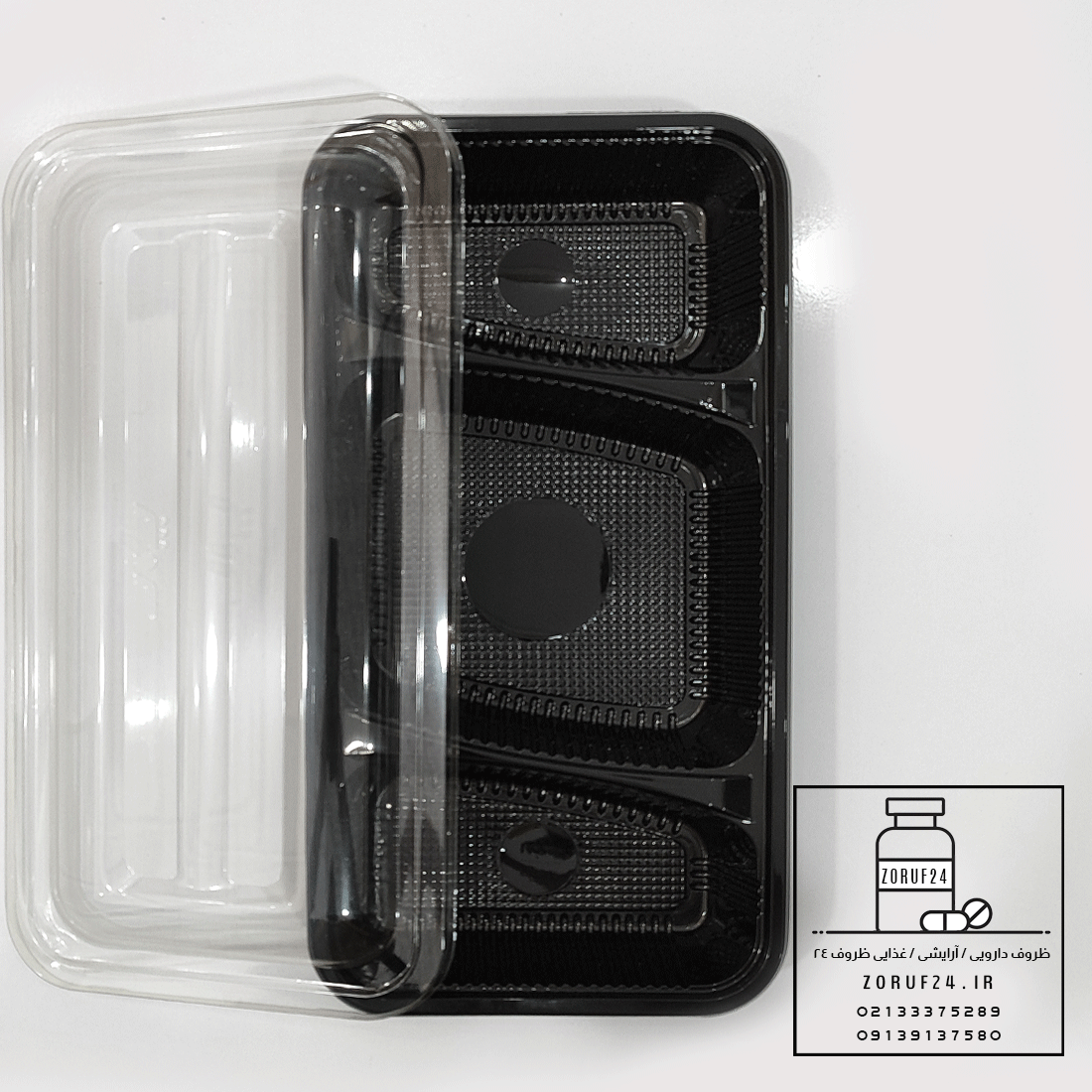 ظرف یکبار مصرف سلفی سه خانه مربع مشکی با قابلیت استفاده در مایکروویو / حداقل تعداد سفارش این محصول ۱۰ عدد می باشد .